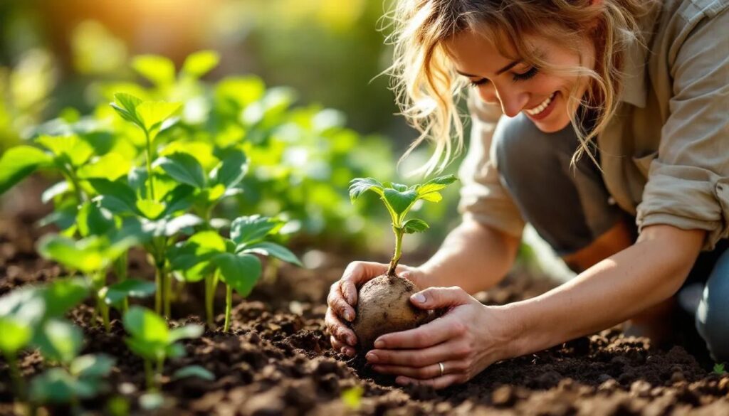 Cover the tuber with the amended soil you set aside, firming gently as you backfill — you want good soil-to-tuber contact without compacting the mixture so hard that drainage is impeded. Create a shallow watering basin — a slight depression in the soil surface around the planting point — to help direct water toward the root zone when you irrigate.